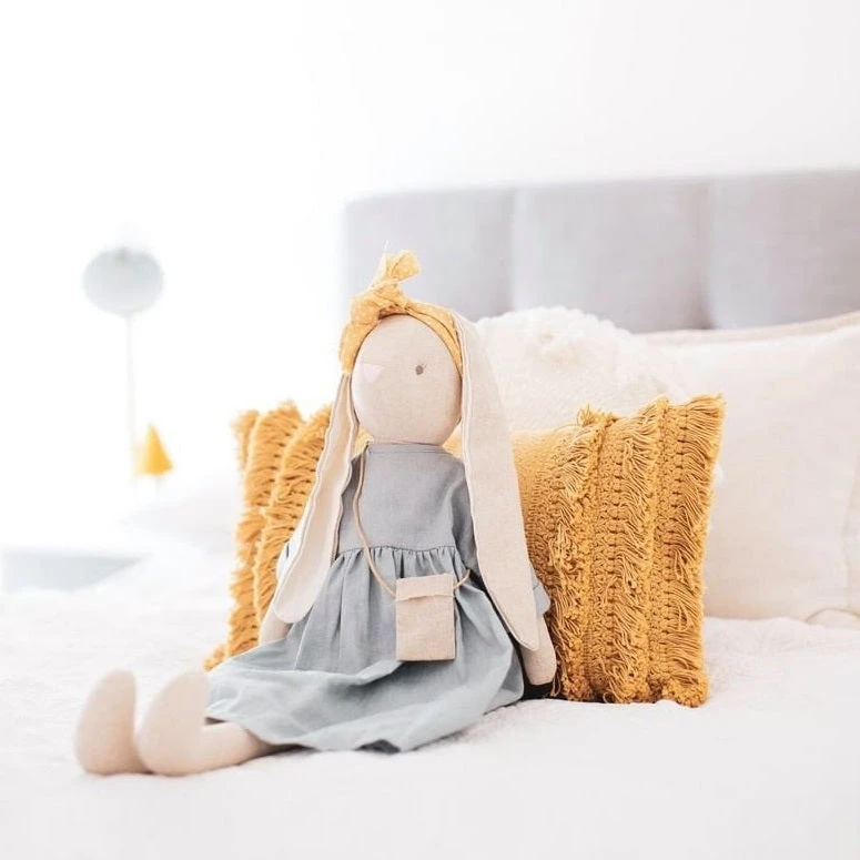 Beautiful Sofia Bunny is part of our range of large Alimrose Designs bunny rabbits. She stands tall at 70cm from top to bottom and looks like she’s off to the markets. Included is her beautiful mustard yellow bow, grey linen dress, and handbag. Please note the fabric of Sofia’s bow may change between batches.