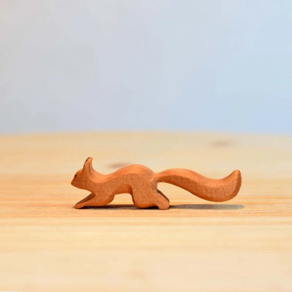 The cheekiest little Bumbu Toys Squirrel, handpainted in soft light brown, with black eyes, ears, and nose and two tiny white teeth poking out of its mouth.