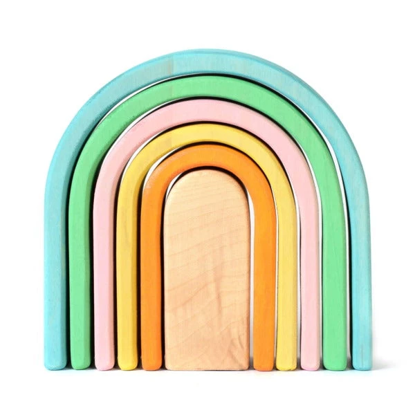 The stunning Pastel Wooden Arches Stacker from Bumbu Toys is oh so pretty and super versatile. A beautiful rainbow of soft blue, aqua green, pale pink, yellow, orange and natural timber, the Arch Stacker can be used by itself to create tunnels or towers or in combination with other blocks to form windows, doors, and turrets.