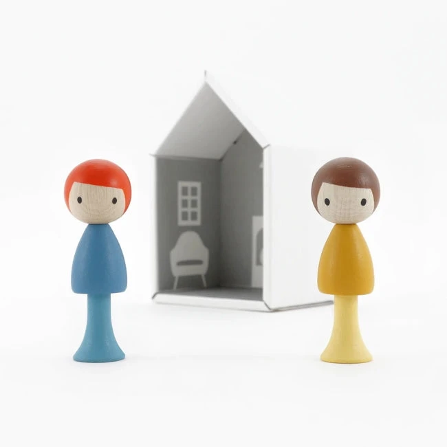 Marco and Ben are a ginger-haired and brown-headed pair of CLiCQUES boys, with handpainted sky blue and golden yellow outfits. Their facial features are deliberately kept minimal to keep these beautiful wooden toys open-ended and ready for your child’s imagination.