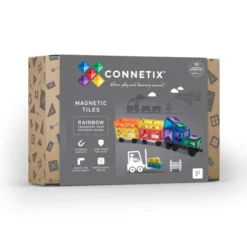 The Connetix 50 Piece Rainbow Transport Pack will appeal to vehicle lovers both young and old. It contains a large grey truck base with wheels, two clear car bases with wheels, and lots of squares, doors, triangles, and rectangles to help your child create their very own truck/van/car/train/bus combinations. The three vehicle bases all have genuine rubber wheels – try zooming them over some of our Waytoplay roads or the arc of a Wobbel Board. The pieces are all compatible with our other Connetix packs.