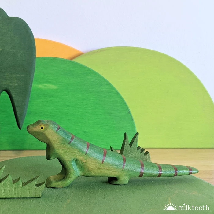Green and gorgeous! Our Forest Melody Wooden Iguana is lovely and long at 15.5cm from tip to tail. Also useful in play as a lizard or goanna, the Iguana has a frill under its chin and has been handpainted in a bright reptilian green, with rich maroon stripes all down its back and tail. Each Forest Melody wooden animal is handmade from gorgeous, textural alder wood.
