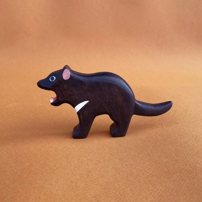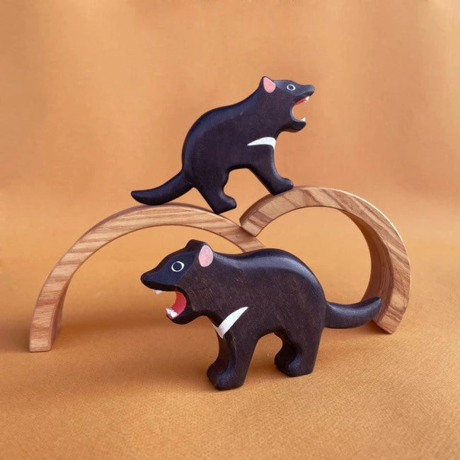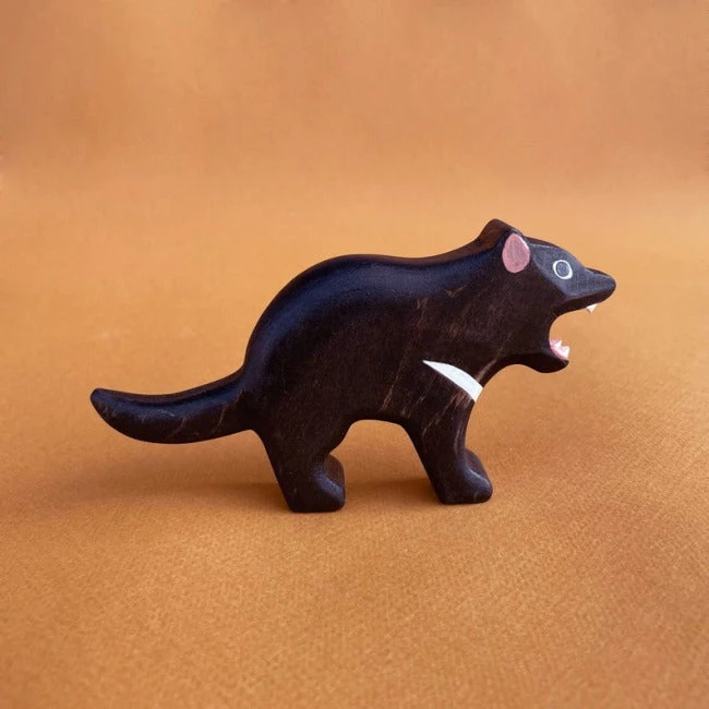 One of five new Australian animals specially created for Milk Tooth in 2021, Forest Melody’s Tasmanian Devil wooden toy is baring its teeth in a characteristic Tassie Devil way… watch your fingers! Handpainted primarily in a deep black with beautiful woodgrain showing through the colour, our Tasmanian Devil features little pink ears, a distinctive white stripe across its chest, sharp white teeth and a dark pink mouth. Each Forest Melody wooden animal is handmade from gorgeous, textural alder wood.