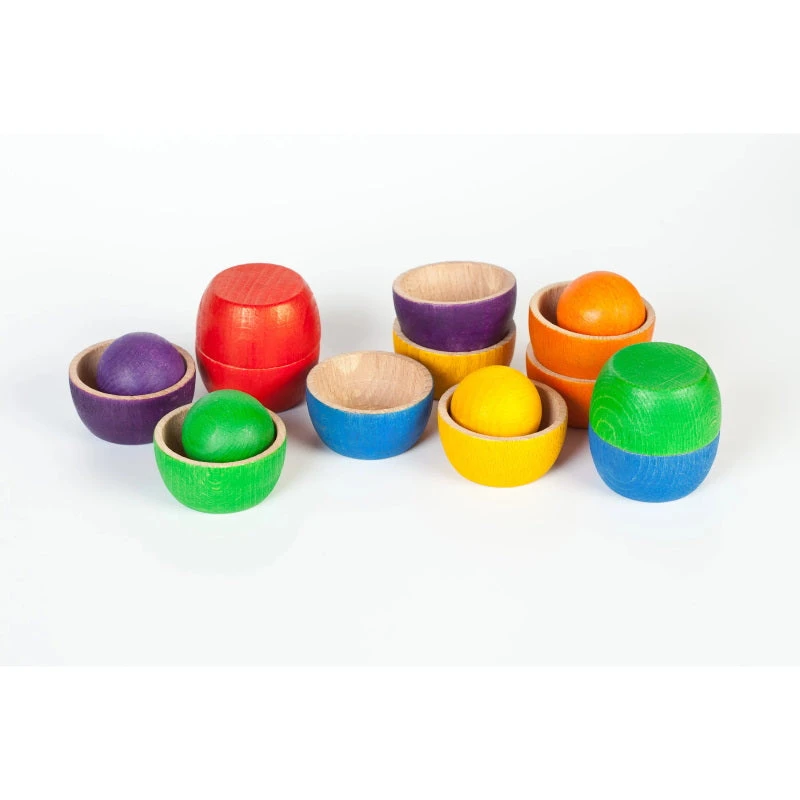Grapat’s Coloured Bowls and Balls are bright and beautiful in gorgeous primary and secondary colours. The wooden balls can be hidden within a pair of bowls, making this Grapat set perfect for children who love peekaboo and other games surrounding the concept of object permanence.