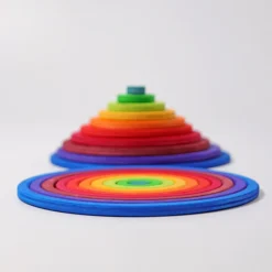Grimm’s Concentric Circles and Rings is a 20 piece building set comprising ten wooden disks and ten wooden rings. A large creative puzzle, your child will delight in using the pieces to make 2D pictures and 3D towers. Combine the Circles & Rings with other building blocks to expand your building possibilities.