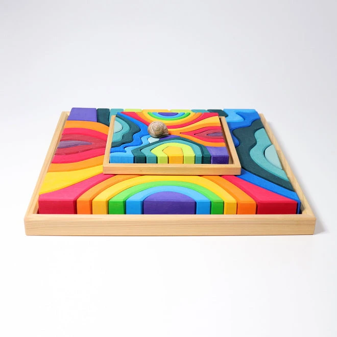 Grimm’s Four Elements Small Puzzle has it all! Both a building set and a jigsaw puzzle, Four Elements can also be split up into various sets of stacking toys in the themes of rainbows, water, fire, and earth. These sets of elements make a wonderful addition to a small world play scene.