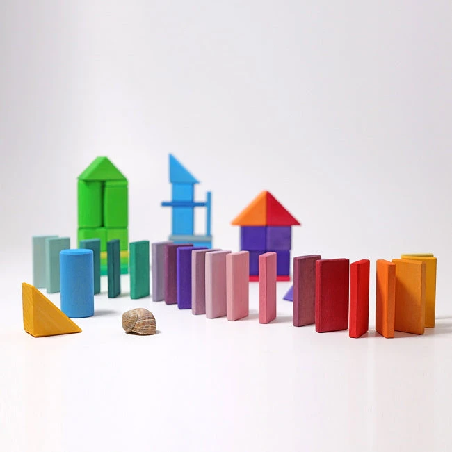 What a wonderful building set from Grimm’s! The Shapes and Colours set has a bit of everything – cylinders, triangular blocks, cubes, rectangular blocks, and slats that can be used as dominoes. The blocks come in a beautiful range of rainbow colours, primarily brights, with the slats also featuring pastel colours.