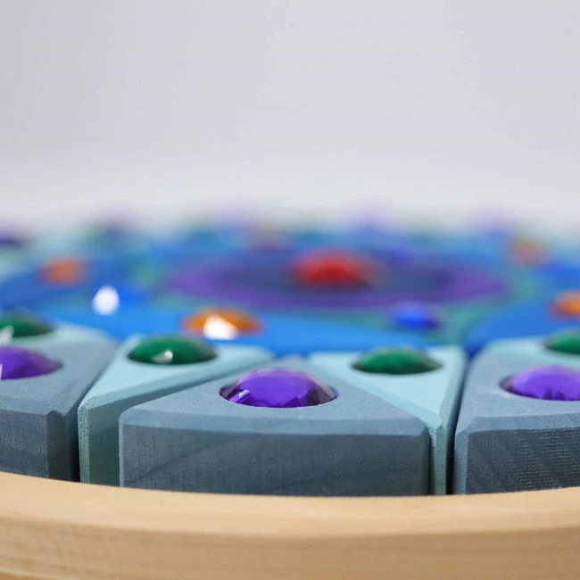 The 44 wooden blocks have been stained a range of blues and purples. All but two of the blocks have inset “jewels” for extra sparkle and delight. Grimm’s Sparkling Mandala Small comes with its own circular timber base tray for easy storage and display.