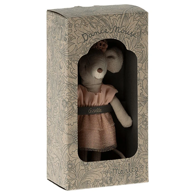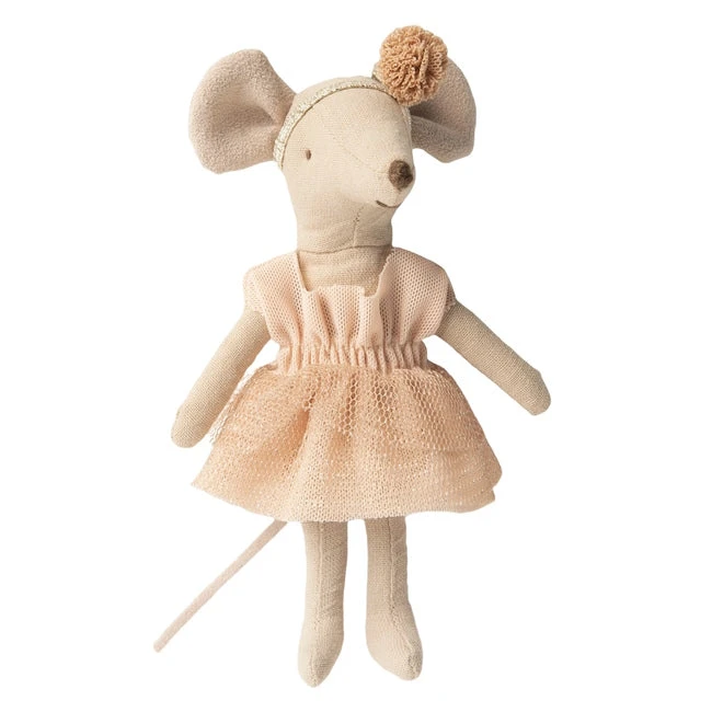 Maileg Dance Mouse Giselle wears the prettiest pale shell pink dress with tulle skirt and a lovely pom pom headband. She has magnets embedded in her hands, so your child can arrange her into graceful dance positions. Giselle is one of Maileg’s very graceful Dance Mice. She’s a Big Sister-sized Maileg Mouse.