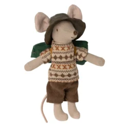 Maileg Hiker Mouse Big Brother just loves to be outdoors! Hiking, camping, kayaking, you name it, he loves it. He has magnets embedded into his hands, meaning he can clasp his hands together and pick up and hold small metal items. Our Hiker Big Brother Mouse wears a brown and beige knit shirt, brown corduroy shorts, a bucket hat, and a dark green sleeping bag strapped to his back. His sleeping bag unrolls for night time.
