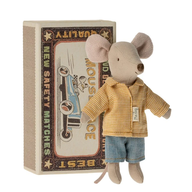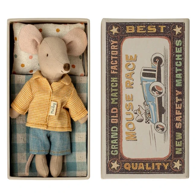 Maileg Mouse Big Brother in Matchbox is snuggled in so sweetly to his little home. A classic Maileg item, this Big Brother Mouse wears a checked mustard shirt and denim blue pants, and sleeps with a pillow, mattress and blanket in complementary muted mustard, blue, rose, and beige colours.