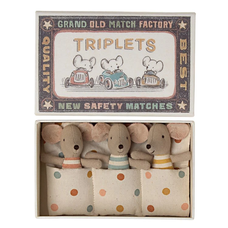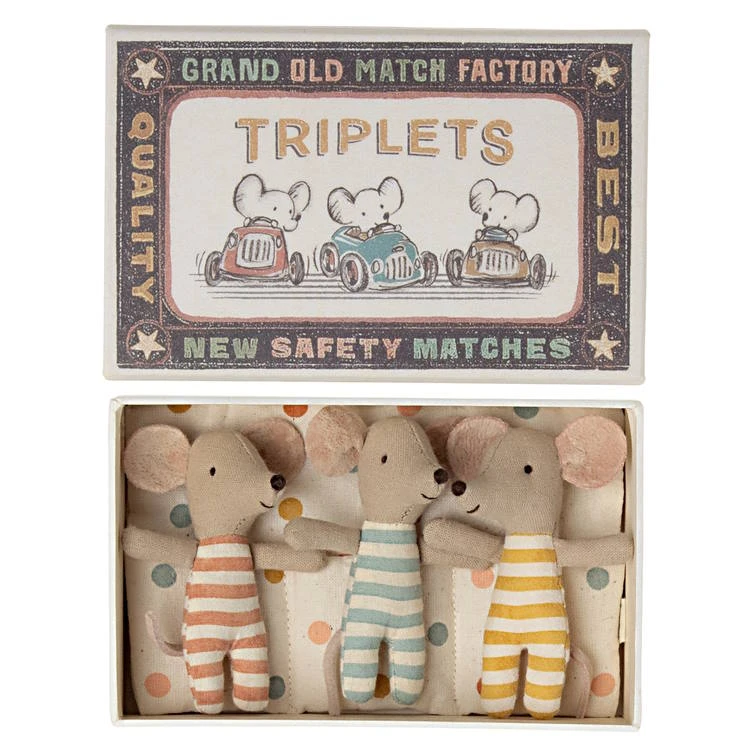 The Maileg Baby Mice Triplets in Matchbox are ready for some fun! These three little stripey babies each have their own little sleeping bag spot in their shared matchbox.