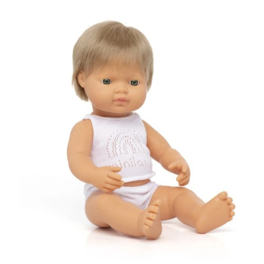 Such a sweet little guy! Our handsome Miniland 38cm Dark Blond Caucasian Boy Baby Doll will quickly become your child’s new little friend. He has the loveliest features and such shiny ash blond hair. Your Caucasian Boy Baby Doll comes complete with a sweet little white singlet and matching pants.