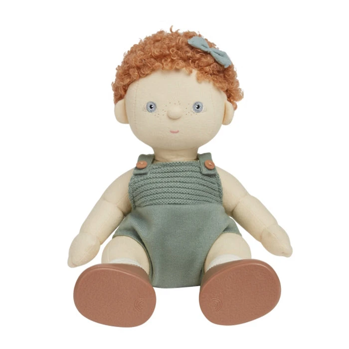 Lovely little Olli Ella Pea Dinkum Doll has pale blue eyes, a smattering of freckles, and curly ginger hair, with a muted green outfit.