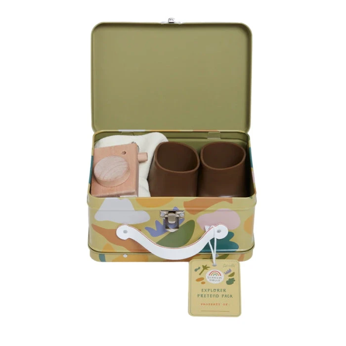 Now your Dinkum Doll can play dress-ups too, with Olli Ella’s gorgeous Pretend Packs! The Olli Ella Dinkum Doll Explorer Pretend Pack includes a very sweet brightly coloured camouflage print tin case, ad ultra-cute little beige safari suit with belt and bucket hat, a mini wooden camera for spotting the animals (or is your dollie spotting dinosaurs?), and slip-on brown boots. Everything your dollie needs to explore new worlds and study the creatures.