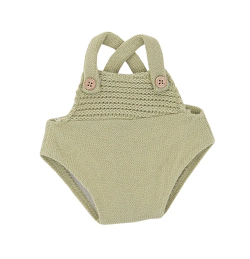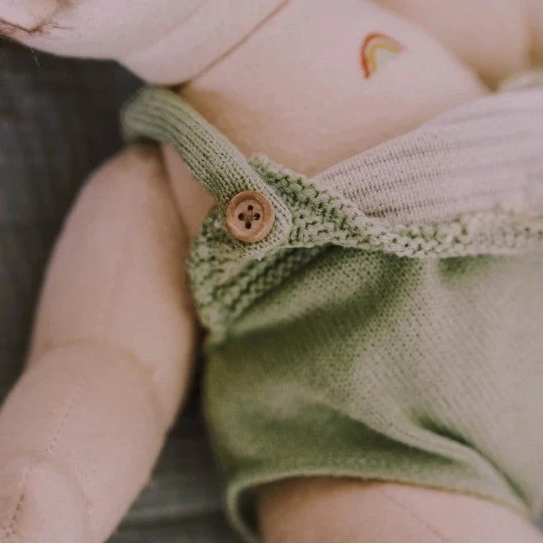 The beautiful Olli Ella Dinkum Doll Rompers are now sold separately – perfect for mixing and matching! The soft green Sage knitted romper is very sweet. It features velcro closures topped with faux buttons, making it easy for little hands to dress and undress their dolly. Made from itch-free knitted acrylic.