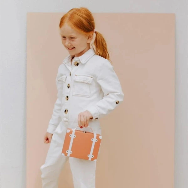- Mini See-Ya Suitcase in Apricot, made using thick cardboard, metal clasp and handle
