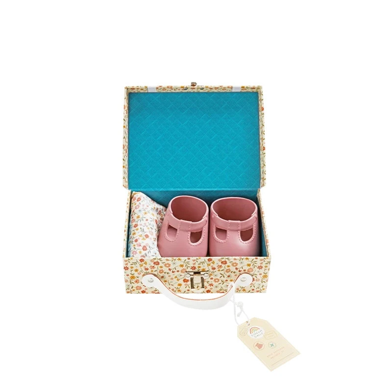 The Olli Ella Blush Travel Togs is delicate and pretty. It includes a lovely pale nude pink romper and a lovely bonnet with Olli Ella’s very special Prairie Floral print. Soft blush shoes match the sweet little mini suitcase.