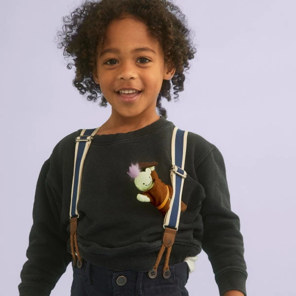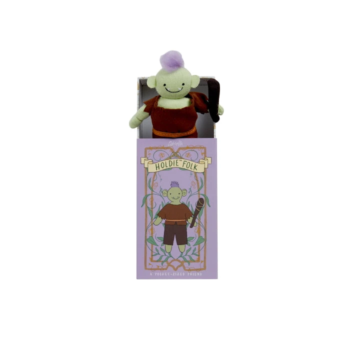 Watch out, here comes Oggy the Ogre! But don’t worry, he’s the friendliest type of ogre there is – just look at his tuft of fun purple hair! With gorgeous green skin, our Olli Ella Oggy the Ogre Holdie Folk holds a soft club and comes dressed in a removable two-piece brown outfit.
