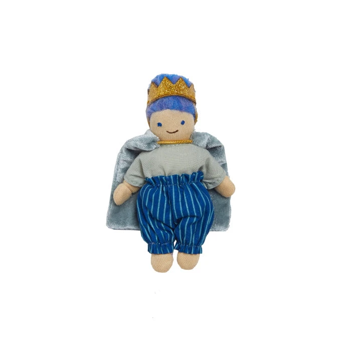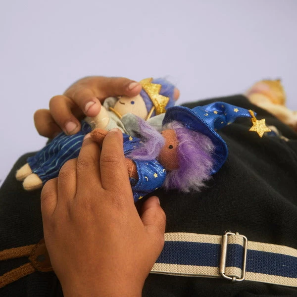 Here’s Prince Galience! A friendly prince with good manners, Olli Ella’s Prince Galience Holdie Folk prefers to make friends with dragons rather than fight them. He wears a little golden crown, stripey royal blue pants, and a regal cape – all of which are removable. Prince Galience’s hair is a wondrous blend of different shades of blue.