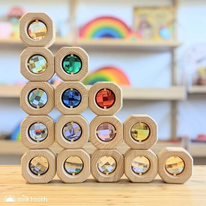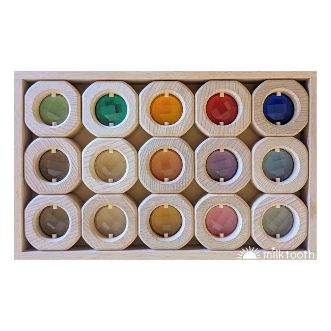 The very beautiful Papoose Bitcoin Windows feature a sparkling transparent window set into the beech timber, able to be seen from either side of the block. This is the Brights & Pastel colourway of 15 windows, which pairs bright colours with pastel colours, both set off by sparkly grey and crystal clear. You will receive one of each bright and pastel colour, and two each of the grey and the clear. Milk Tooth has created this custom colourway by mixing the Rainbow and Earth Bitcoin sets.