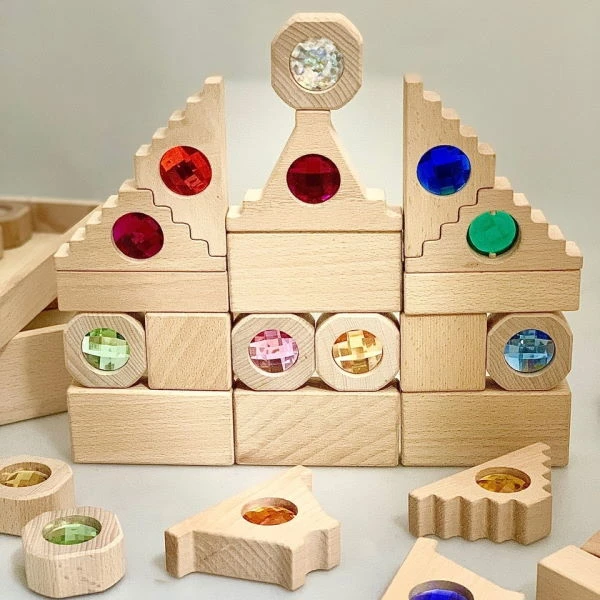 - 16 wooden building blocks, each containing one inset acrylic “gem” on one side