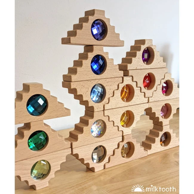 The beautiful architecture of the Netherlands brought to your playroom in the form of these gorgeous Papoose Dutch Step Gable Blocks and Windows. This is a mix pack, with half of the stepped blocks having a sparkly gem set into one side, and half having a see-through window set into and visible from both sides of the block. The gem blocks included are all in cool colours and the windows are in warm colours, creating a beautiful rainbow set.