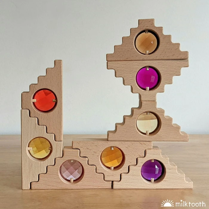 - 8 wooden building blocks, each containing one transparent “window”, visible from both sides, all in warm colours of pink, orange, yellow, red, and purple