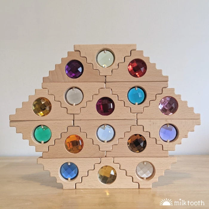 The beautiful architecture of the Netherlands brought to your playroom in the form of these gorgeous Papoose Dutch Step Gable Blocks and Windows. This is a mix pack, with half of the stepped blocks having a sparkly gem set into one side, and half having a see-through window set into and visible from both sides of the block. The gem blocks included are all in warm colours and the windows are in cool colours, creating a beautiful rainbow set.