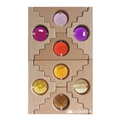 - 8 wooden building blocks, each containing one transparent “jewel”, visible from both sides