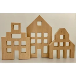 The beautiful architecture of the Netherlands brought to your playroom with these elegant Papoose Dutch Wood Houses. These are the perfect match to Bauspiel Lucite Cubes! Pop some cubes into the square holes to create colourful windows, and then let the light shine through. You can also use them alone to create gorgeous story scenes involving cityscapes and apartment blocks for small world friends.