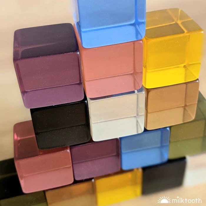 Papoose Lucite Cubes really add something special and different when combined with a set of building blocks. Their transparency invites children to play with light and colour, adding windows, moats, doors, and rivers to their creations. Papoose Acrylic Cubes can be submerged in water so are also wonderful for bathtime play. They are simply stunning.