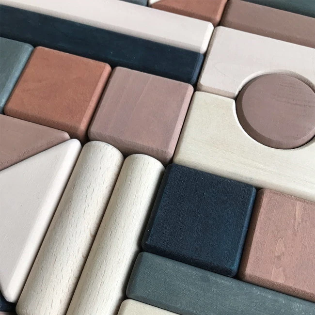 The Multi-Coloured SABO Concept Castle Blocks have been stained in deep navy/teal, dark olive grey-green, milk chocolate, terracotta, and white wash, with a few blocks left in their natural timber state. They have rounded edges and corners and a beautiful tactile matte feel, meaning they stack and balance easily. The blocks have a base dimension of 4cm, making them compatible with other popular wooden building block brands.