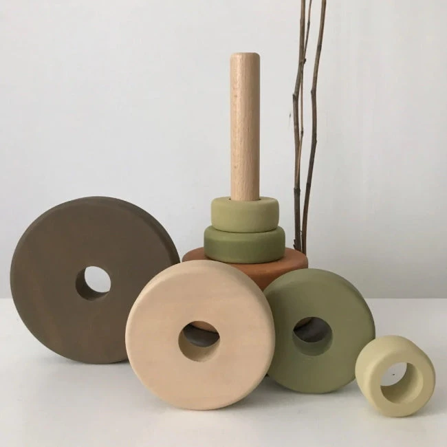 The Olive SABO Concept Stacking Tower features earthy tones of khaki, olive green, light green, terracotta, chocolate brown, and fawn. A delightful piece that would look beautiful in any nursery or playroom and is instantly appealing to little hands.